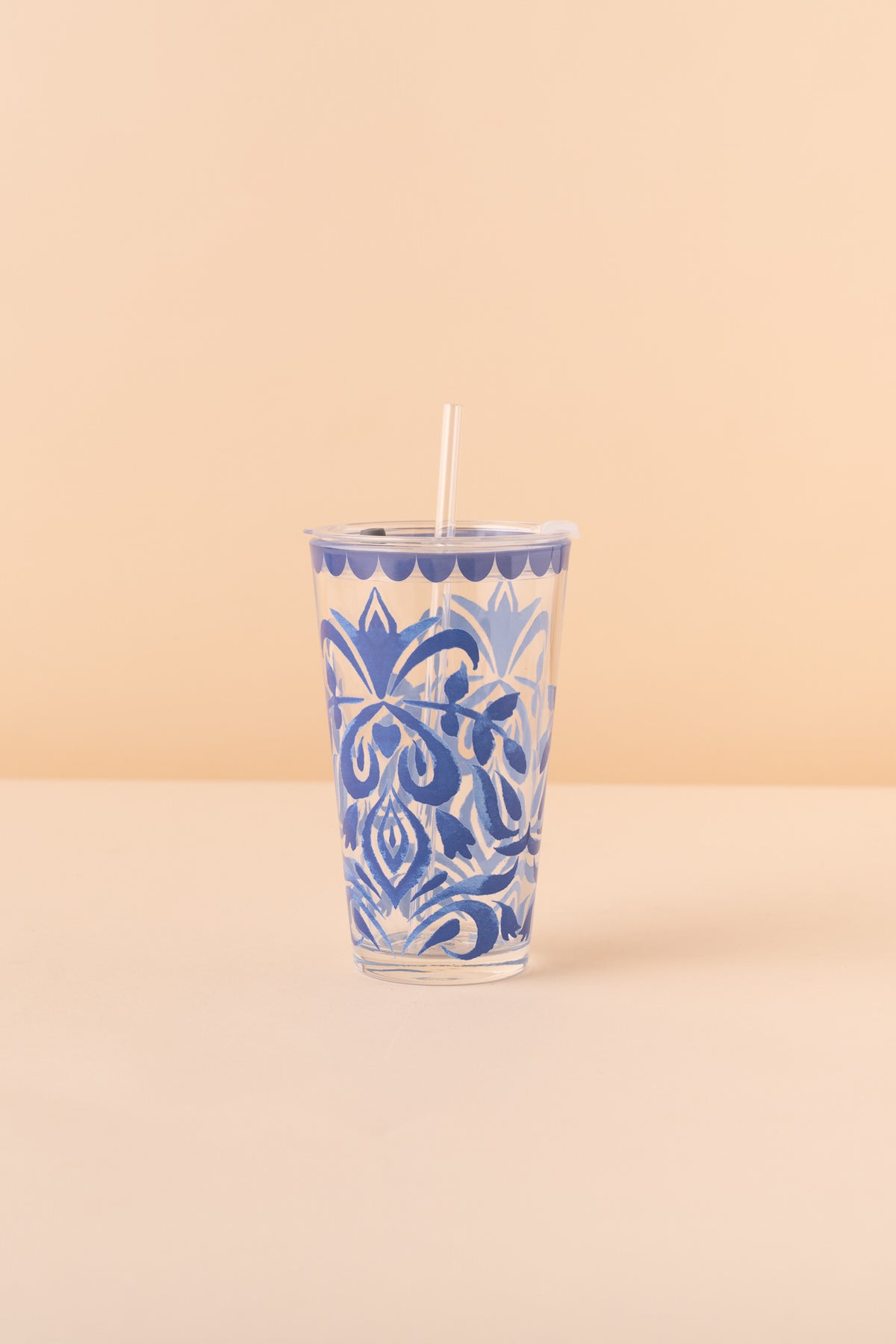 A glass mug with lid and straw.